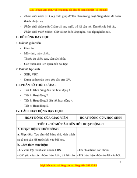 - Tiết 1: Khởi động đến hết hoạt động 1. - Tiết 2: Hoạt động 2.