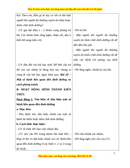 - Thực hiện được các việc làm để phòng, tránh một số bệnh liên quan đến dinh dưỡng. 3. Phẩm chất: 1