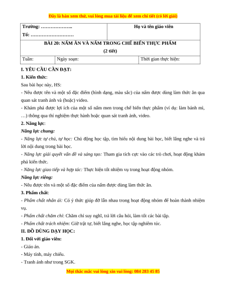 BÀI 20: NẤM ĂN VÀ NẤM TRONG CHẾ BIẾN THỰC PHẨM (2 tiết) Tuần: Ngày soạn: Thời gian thực hiện: I. YÊU CẦU CẦN ĐẠT: 1. Kiến thức: Sau bài học này, HS: