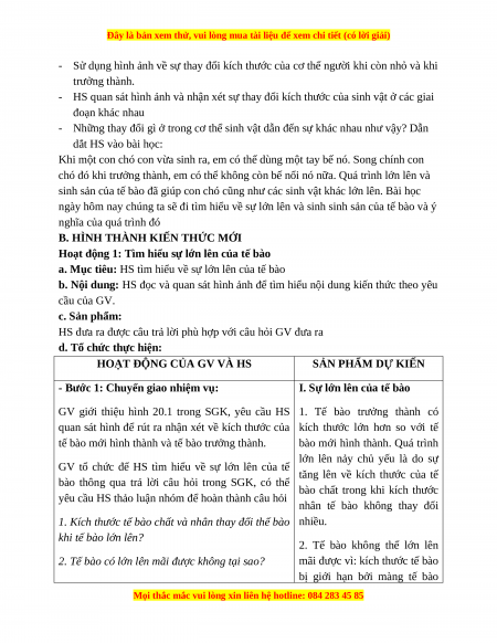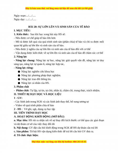 BÀI 20: SỰ LỚN LÊN VÀ SINH SẢN CỦA TẾ BÀO I. MỤC TIÊU: