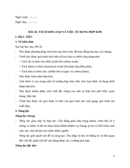 BÀI 20. TÁCH KIM LOẠI VÀ VIỆC SỬ DỤNG HỢP KIM I. MỤC TIÊU 1. Về kiến thức Sau bài học này, HS sẽ: