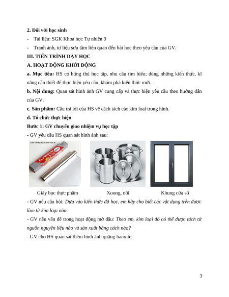 - Tài liệu: SGK, SGV Khoa học Tự nhiên 9, các hình ảnh, video về các loại quặng,