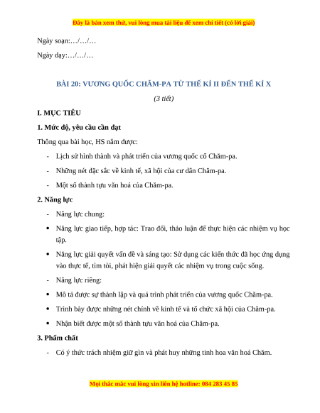 BÀI 20: VƯƠNG QUỐC CHĂM-PA TỪ THẾ KỈ II ĐẾN THẾ KỈ X (3 tiết) I. MỤC TIÊU