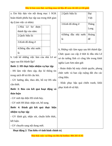 hoàn thành phiếu học tập sau trong thời gian Việt 4p (Làm việc cá nhân) 3.Kinh đô đóng ở Thăng 1.Nhà Lê Sơ được Long thành lập vào năm: 2.Quốc hiệu là: