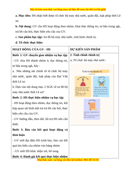 a. Mục tiêu: HS nhận biết được tổ chức bộ máy nhà nước, quân đội, luật pháp thời Lê