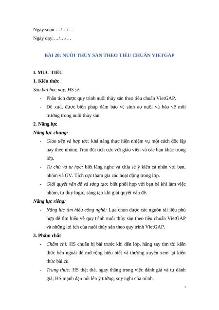 - Phân tích được quy trình nuôi thủy sản theo tiêu chuẩn VietGAP.