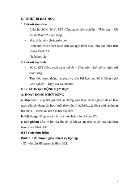 Giáo án Bài 20: Nuôi thuỷ sản theo tiêu chuẩn VietGAP Công nghệ Lâm nghiệp Thủy sản 12 Kết nối tri thức