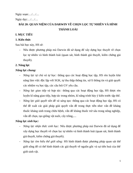 BÀI 20: QUAN NIỆM CỦA DARWIN VỀ CHỌN LỌC TỰ NHIÊN VÀ HÌNH THÀNH LOÀI I. MỤC TIÊU 1. Kiến thức Sau bài học này, HS sẽ:
