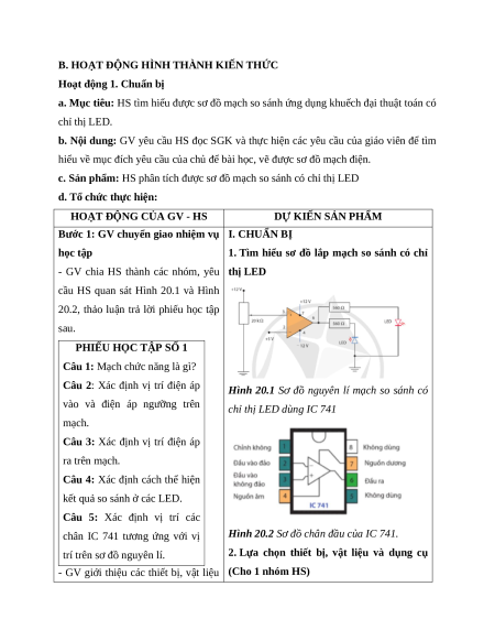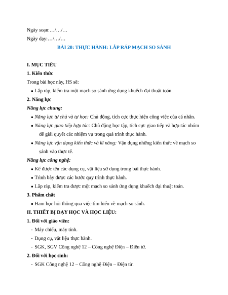 Giáo án Bài 20: Thực hành: Lắp ráp mạch so sánh (2024) Công nghệ Điện - Điện tử 12 Cánh diều