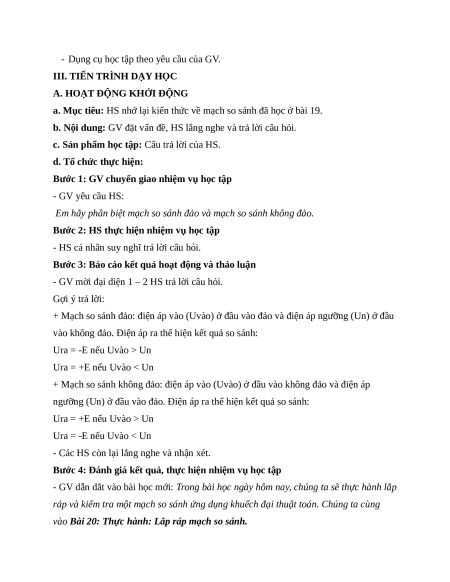 BÀI 20: THỰC HÀNH: LẮP RÁP MẠCH SO SÁNH I. MỤC TIÊU 1. Kiến thức