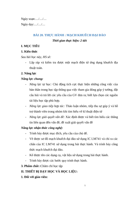- Lắp ráp và kiểm tra được một mạch điện tử ứng dụng khuếch địa thuật toán. 2. Năng lực