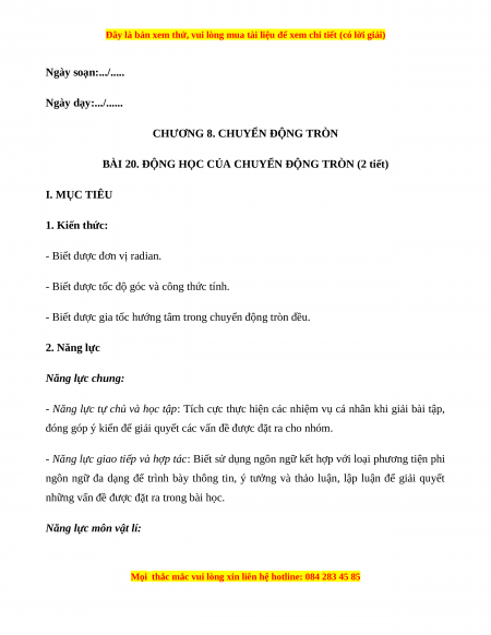 BÀI 20. ĐỘNG HỌC CỦA CHUYỂN ĐỘNG TRÒN (2 tiết) I. MỤC TIÊU 1. Kiến thức: