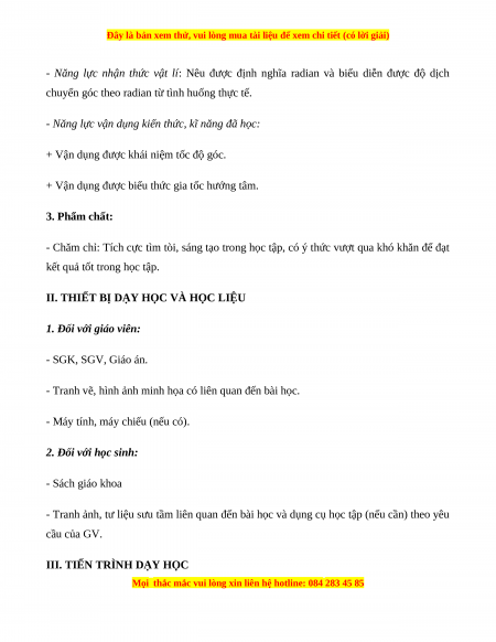 - Năng lực nhận thức vật lí: Nêu được định nghĩa radian và biểu diễn được độ dịch