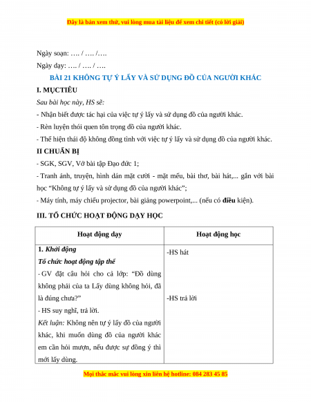 Giáo án Bài 21 Đạo đức 1 Kết nối tri thức: Không tự ý lấy và sửa dụng đồ của người khác