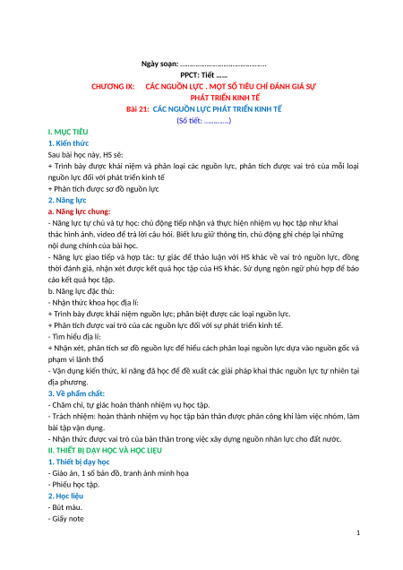Bài 21: CÁC NGUỒN LỰC PHÁT TRIỂN KINH TẾ (Số tiết: ………….) I. MỤC TIÊU 1. Kiến thức