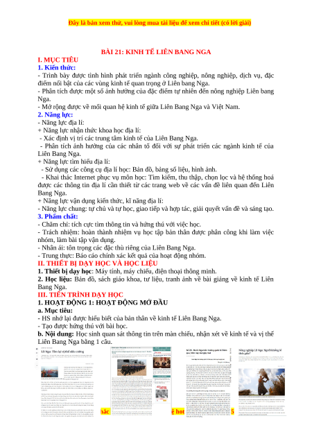 - Mở rộng được về mối quan hệ kinh tế giữa Liên Bang Nga và Việt Nam. 2. Năng lực: - Năng lực địa lí: