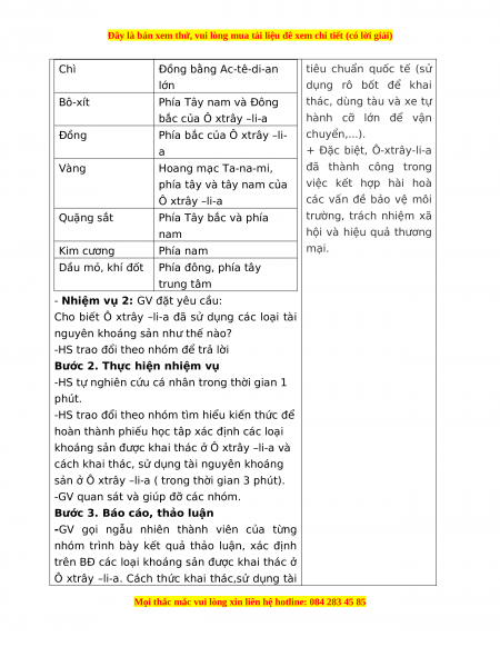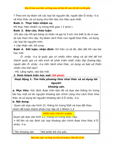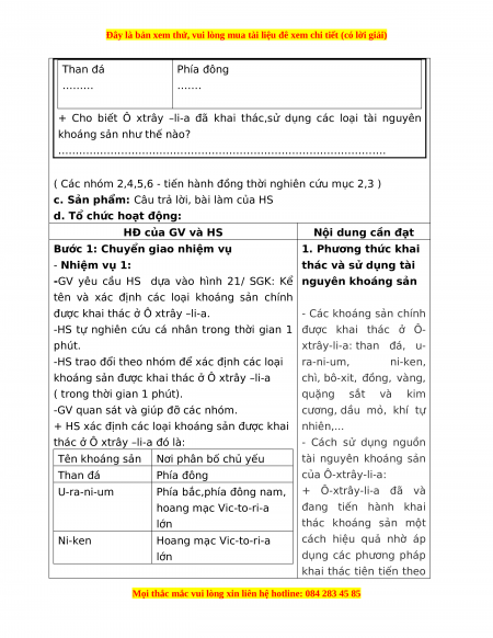 - Học liệu: Bản đồ khoáng sản Ô xtrây –li-a; SGK, Phiếu học tập, tranh ảnh địa lí.