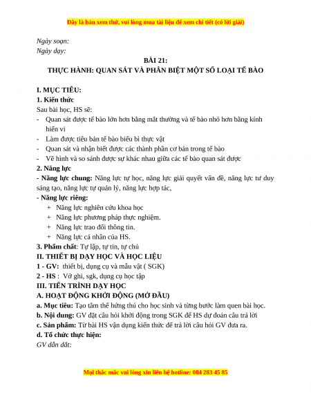 Giáo án Bài 21 KHTN 6 Kết nối tri thức (2024): Thực hành: Quan sát và phân biệt một số loại tế bào