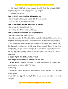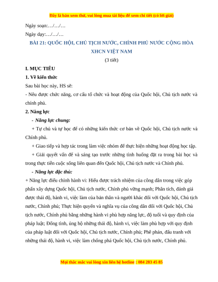 BÀI 21: QUỐC HỘI, CHỦ TỊCH NƯỚC, CHÍNH PHỦ NƯỚC CỘNG HÒA XHCN VIỆT NAM (3 tiết) I. MỤC TIÊU 1. Về kiến thức Sau bài học này, HS sẽ: