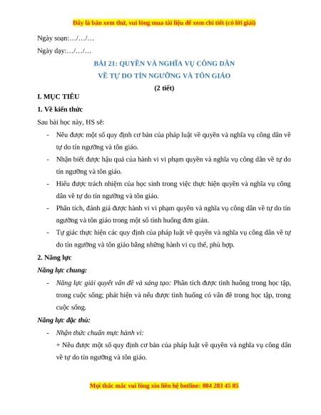 VỀ TỰ DO TÍN NGƯỠNG VÀ TÔN GIÁO (2 tiết) I. MỤC TIÊU 1. Về kiến thức Sau bài học này, HS sẽ: