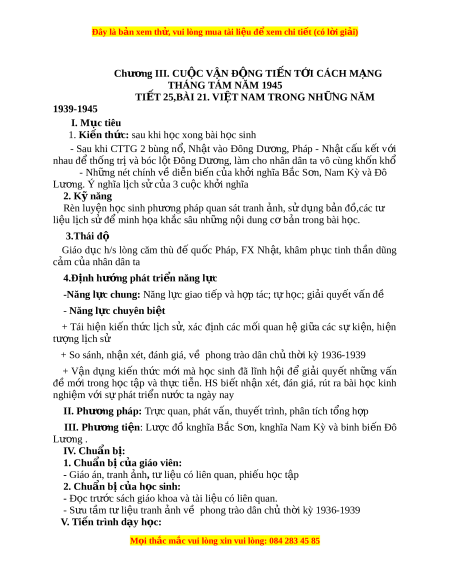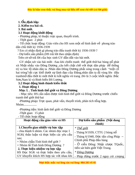 Đây là bản xem th , vu ử i lòng mua tài li u ệ đ xe ể m chi ti t (c ế ó l i ờ gi i ả ) 1. n đ Ổ nh l ị p ớ : 2. Ki m ể tra bài cũ. 3. Bài m i ớ . 3.1 Hoạt đ ng k ộ h i ở đ ng ộ - Phư ng pháp, kĩ ơ thu t ậ : tr c quan, t ự huy t ế trình. - Th i ờ gian: 2 phút - Tổ ch c ho ứ t ạ đ ng: ộ Giáo viên cho HS xem m t ộ s hì ố nh nh ả v phong t ề rào dân chủ th i ờ kỳ 1936-1939 ? Em có nh n ậ đ nh gì ị phong trào đ u t ấ ranh th i ờ kỳ 1936-1939 ? - D ki ự n s ế n ph ả ẩm (HS tr l ả i ờ theo nh n đ ậ nh ị ) Trên cơ s t ở r l ả i ờ c a ủ h c s ọ inh GV d n d ẫ t ắ vào bài m i ớ . GV nh n ậ xét vào bài m i ớ : -Sau khi chi n ế tranh th ế gi i ớ th