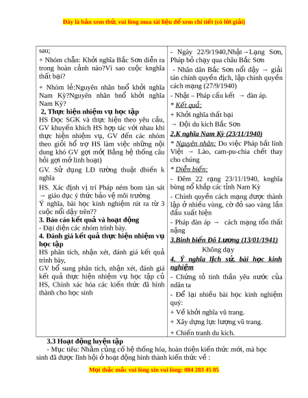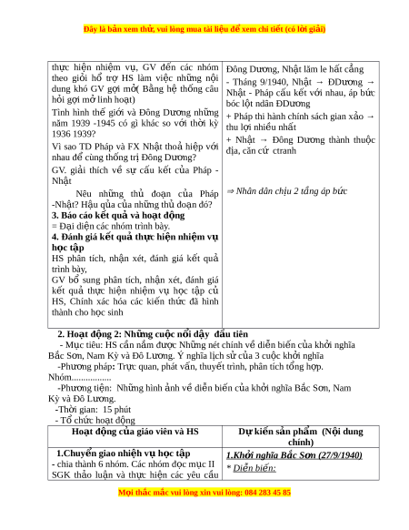 ủ Pháp Nhân dân chịu 2 tầng áp b c ứ -Nh t ậ ? H u q ậ a c ủ a ủ nh ng t ữ h đo ủ n ạ đó? 3. Báo cáo k t ế qu và ho ả t ạ đ ng ộ = Đ i ạ di n các ệ nhóm trình bày. 4. Đánh giá k t ế qu t ả h c hi ự n nhi ệ m ệ vụ h c ọ tập HS phân tích, nh n ậ xét, đánh giá k t ế quả trình bày, GV bổ sung phân tích, nh n ậ xét, đánh giá k t ế quả th c ự hi n ệ nhi m ệ vụ h c ọ t p ậ củ HS, Chính xác hóa các ki n ế th c ứ đã hình thành cho h c s ọ inh 2. Hoạt đ ng 2 ộ : Nh ng cu ữ c n ộ i ổ d y đ ậ u t ầ iên - M c ụ tiêu: HS c n n ầ m ắ đư c N ợ h ng ữ nét chính v di ề n bi ễ n c ế a ủ kh i ở nghĩa B c S ắ n, N ơ am Kỳ và Đô Lư ng. Ý ơ nghĩa l ch s ị ử c a 3 cu ủ c ộ kh i ở nghĩa -Phư ng pháp ơ : Tr c quan, phát ự vấn, thuy t ế trình, phân tích t ng h ổ p. ợ Nhóm................. -Phư ng t ơ i n: ệ Nh ng hì ữ nh nh v ả di ề n ễ bi n ế c a kh ủ i ở nghĩa B c S ắ n, ơ Nam Kỳ và Đô Lư ng. ơ -Th i ờ gian: 15 phút - Tổ ch c ho ứ t ạ đ ng ộ Hoạt đ ng c ộ a g ủ iáo viên và HS Dự ki n s ế n ph ả m ẩ (N i ộ dung chính) 1.Chuy n gi ể ao nhi h v ệ h ụ c ọ t p ậ 1.Kh i ở nghĩa B c ắ S n ( ơ 27/9/1940)