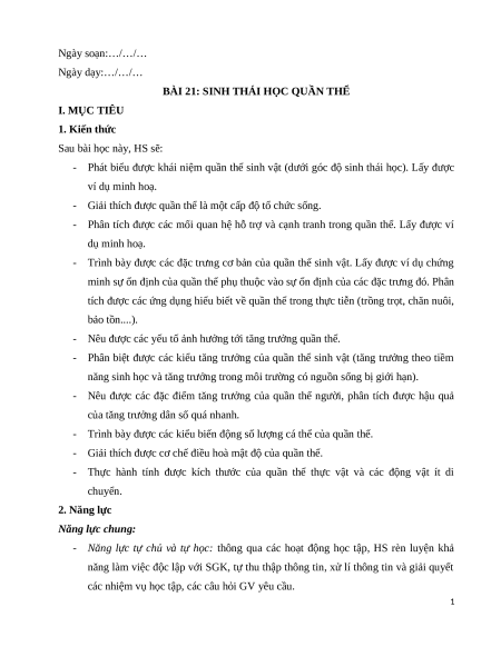 Giáo án Bài 21 Sinh học 12 Cánh diều: Sinh thái học quần thể