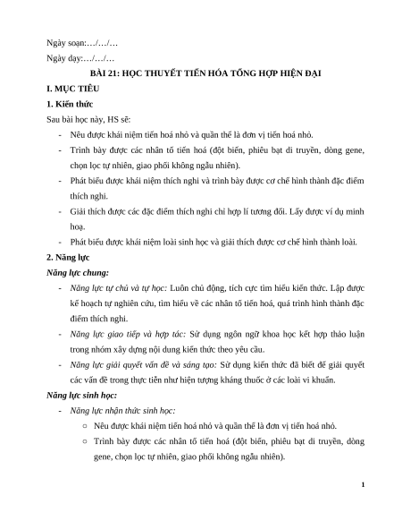 BÀI 21: HỌC THUYẾT TIẾN HÓA TỔNG HỢP HIỆN ĐẠI I. MỤC TIÊU 1. Kiến thức Sau bài học này, HS sẽ: