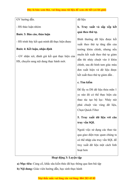 TÊN BÀI DẠY: THỰC HÀNH CẬP NHẬT VÀ TRUY XUẤT DỮ LIỆU CÁC BẢNG Môn: Tin học; Lớp: 11