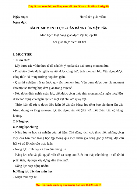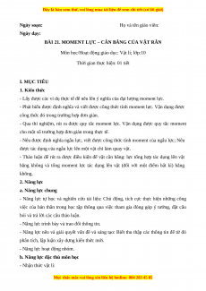 Giáo án Bài 21 Vật lí 10 Kết nối tri thức (2024): Moment lực - Cân bằng lực của vật rắn