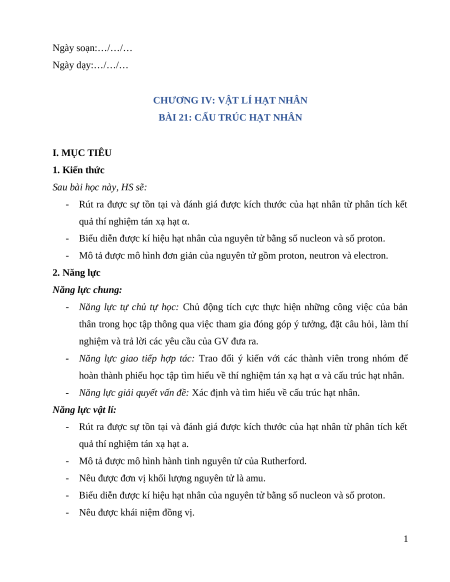 Giáo án Bài 21 Vật Lí 12 Kết nối tri thức (2025): Cấu trúc hạt nhân