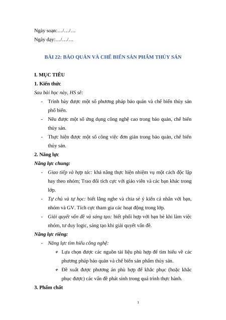 BÀI 22: BẢO QUẢN VÀ CHẾ BIẾN SẢN PHẨM THỦY SẢN I. MỤC TIÊU 1. Kiến thức
