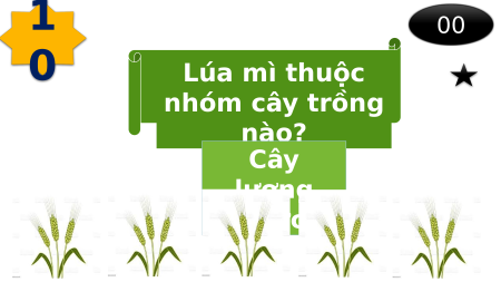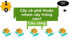 - Đội có số điểm cao nhất chiến thắng. CON SỐ MA 1 Y MẮN 10 10 0 20 20 20 30 30 G 30 O 1 20 19 18 17 16 15 14 13 12 11 1 0 0 Lúa mì thuộc nhóm cây trồng nào? Cây lương thực 1 20 19 18 17 16 15 14 13 12 11 1 0 0 Cây cà phê thuộc nhóm cây trồng nào? Cây công nghiệp