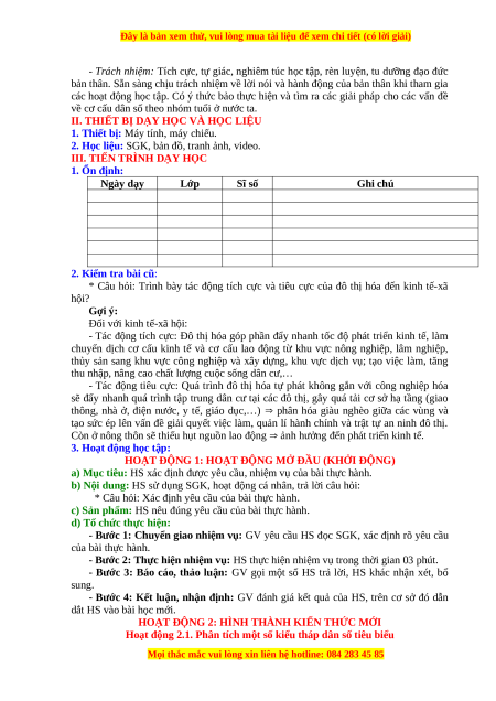 * Câu hỏi: Trình bày tác động tích cực và tiêu cực của đô thị hóa đến kinh tế-xã hội? Gợi ý: