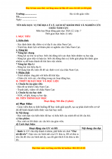 TÊN BÀI DẠY: VỊ TRÍ ĐỊA LÝ LÝ, LỊCH SỬ KHÁM PHÁ VÀ NGHIÊN CỨU CHÂU NAM CỰC