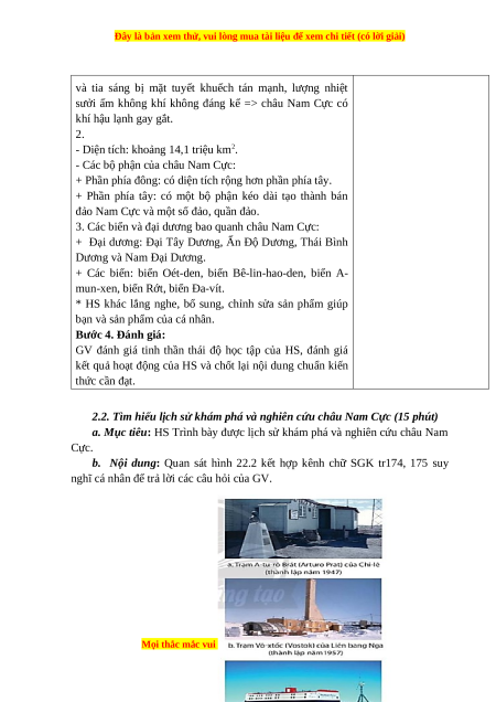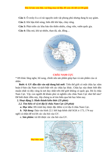 Giáo án Bài 22 Địa lí 7 Chân trời sáng tạo: Vị trí địa lí, lịch sự khám phá và nghiên cứu châu Nam Cực