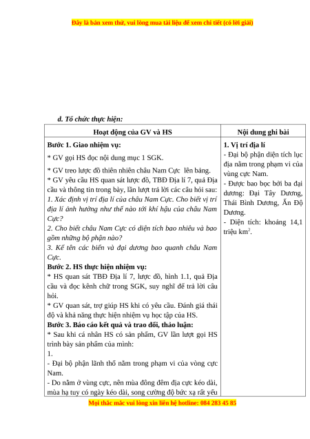 Phần: Địa lí, Lớp: 7, Thời lượng: dạy 1 tiết I. MỤC TIÊU 1. Về kiến thức