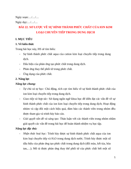 Giáo án Bài 22 Hóa học 12 Cánh Diều: Hình thành phức chất của ion kim loại chuyển tiếp trong dung dịch