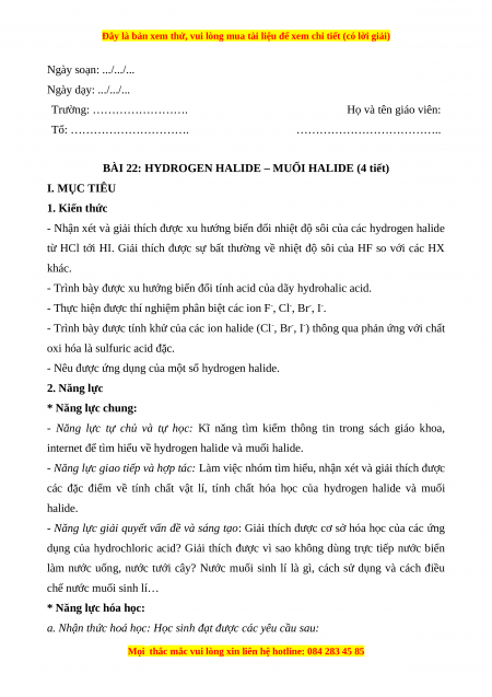 BÀI 22: HYDROGEN HALIDE – MUỐI HALIDE (4 tiết) I. MỤC TIÊU 1. Kiến thức