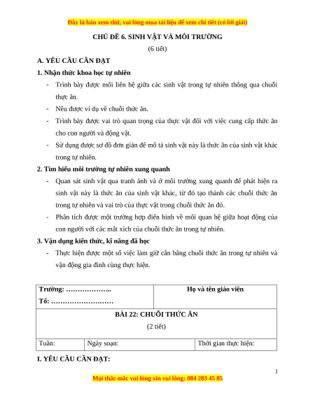 BÀI 22: CHUỖI THỨC ĂN (2 tiết) Tuần: Ngày soạn: Thời gian thực hiện: