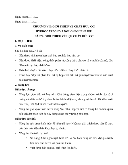 - Trình bày được sự phân loại sơ bộ hợp chất hữu cơ gồm hydrocarbon và dẫn xuất của hydrocarbon. 2. Năng lực