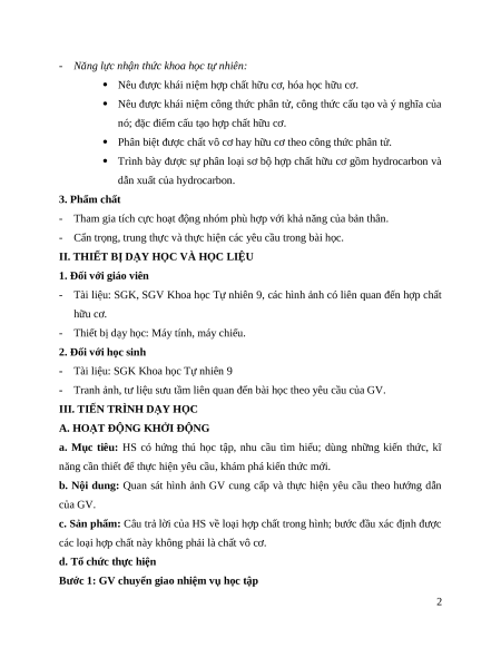 - Tài liệu: SGK, SGV Khoa học Tự nhiên 9, các hình ảnh có liên quan đến hợp chất hữu cơ.