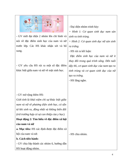 a. Mục tiêu: HS xác định được đặc điểm xã hội của nam và nữ. - HS chia nhóm.