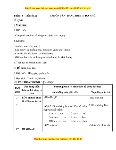 Tuần: 5 Tiết số: 22 BÀI: ÔN TẬP - BẢNG ĐƠN VỊ ĐO KHỐI LƯỢNG I/ Mục tiêu: 1. Kiến thức: