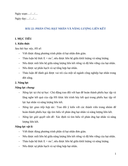 BÀI 22: PHẢN ỨNG HẠT NHÂN VÀ NĂNG LƯỢNG LIÊN KẾT I. MỤC TIÊU 1. Kiến thức