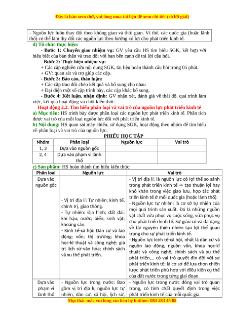 c) Sản phẩm: HS hoàn thành tìm hiểu kiến thức: Phân loại Nguồn lực Vai trò Dựa vào