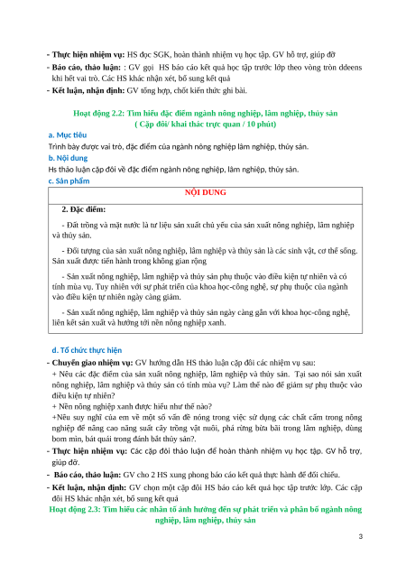 Hs thảo luận cặp đôi về đặc điểm ngành nông nghiệp, lâm nghiệp, thủy sản. c. Sản phẩm NỘI DUNG 2. Đặc điểm: