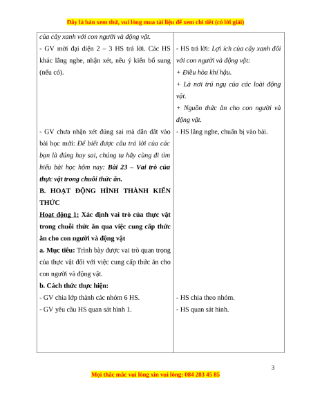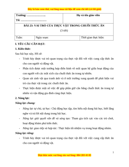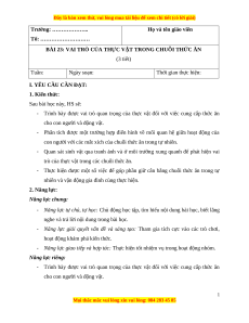 BÀI 23: VAI TRÒ CỦA THỰC VẬT TRONG CHUỖI THỨC ĂN (3 tiết) Tuần: Ngày soạn: Thời gian thực hiện: