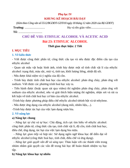 Giáo án Bài 23 Khoa học tự nhiên 9 Cánh Diều (2024): Ethylic alcohol