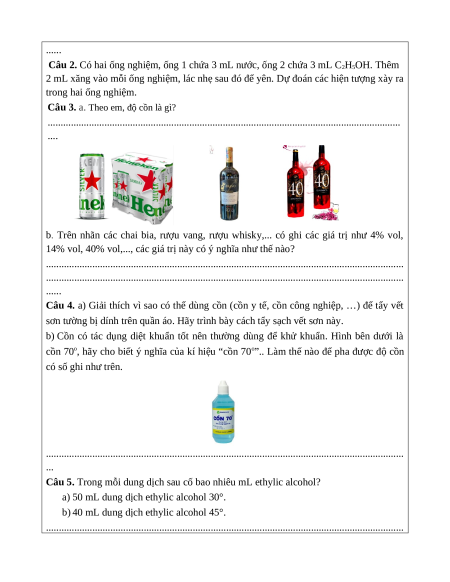 Câu 1. HS quan sát và trình bày một số tính chất vật lí của ethylic alcohol: trạng thái, màu sắc, mùi,… Rượu gạo Cồn 700 Cồn 900 Cồn nguyên chất